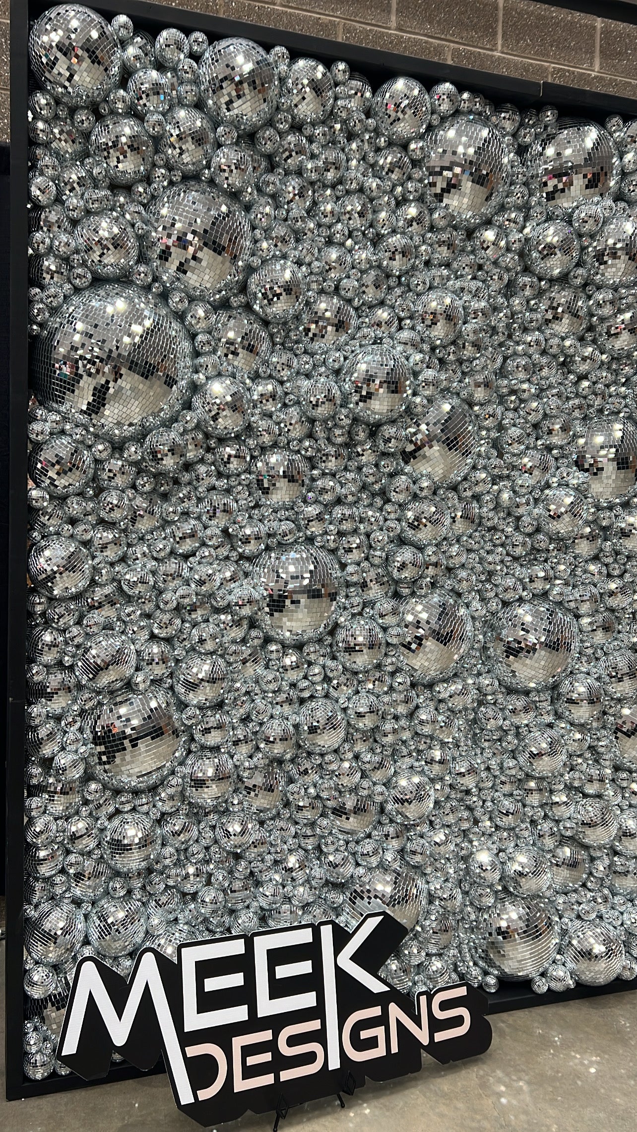Full-size wall (8'x8'). The full wall is priced at $1,050, offering a grand display of mirrored disco balls that brilliantly catch and reflect light, creating an enchanting and dynamic ambiance. Perfect for adding a touch of glittering charm.